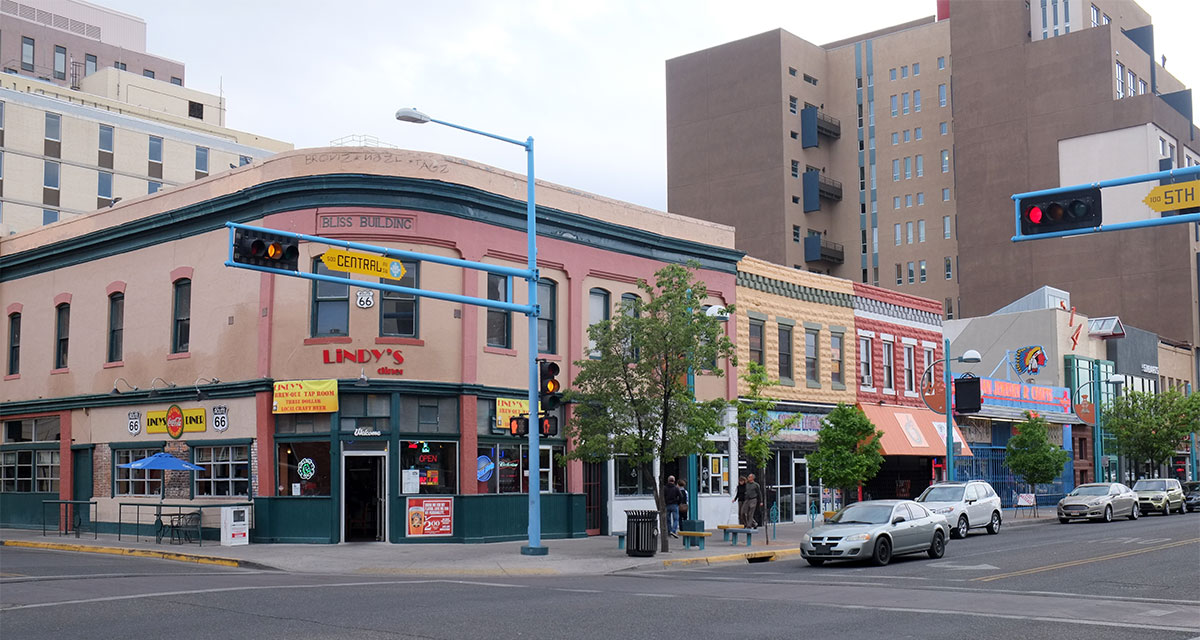 When the railroad arrived in the 1880s, it didn’t pass within miles of the Old Town, so a new downtown grew around the station a couple of miles away.   This core of Albuquerque was built during the first half of the 20th century – it has a regular grid, and it has classic commercial and mixed-use buildings from this era.  Central Avenue, the main east-west street, was part of the old Route 66, and there are many remnants from this era.