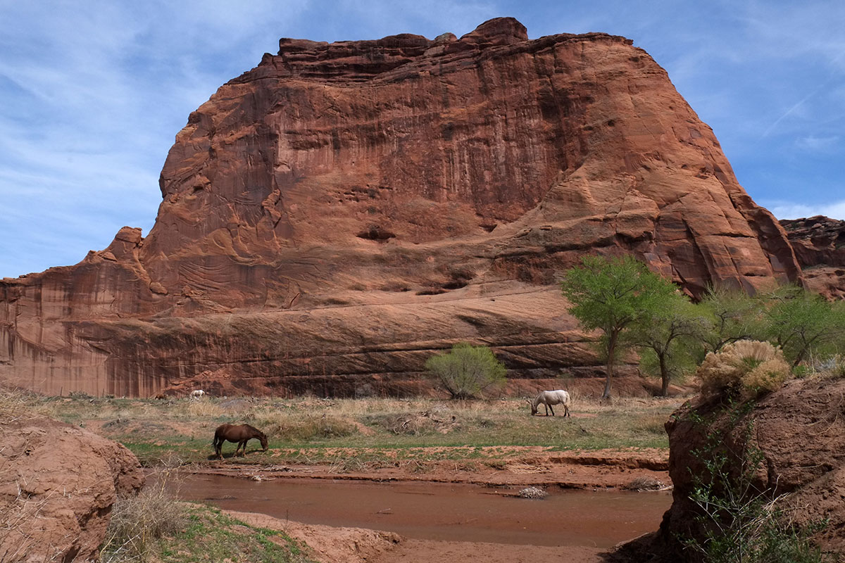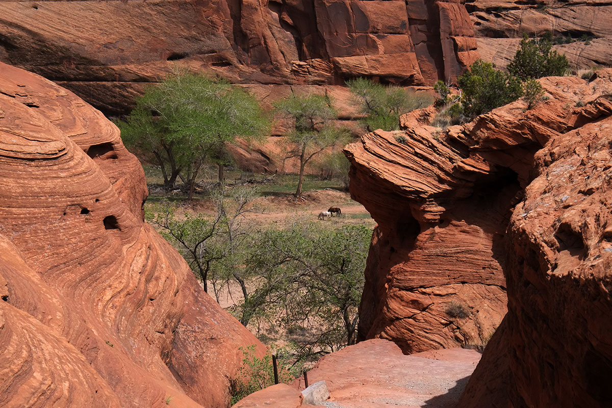 On reaching the bottom, the trail runs along the river, with the horses as the perfect scale figures in the landscape. This is what makes Tsegi different from all other places in the Southwest – the pastoral. Whereas most of the Southwest is beautiful for its awe-some qualities – the sense that untamed nature dwarfs us and our puny human sensibilities, and a few places are appealing because we think humans could actually survive here for more than a day – Tsegi is an inhabited landscape. We can see evidence of human habitation through time and into the present, and we have the stark contrast between the horses calmly grazing against the sheer cliff behind.DSCF8789WhiteHouseTrail031