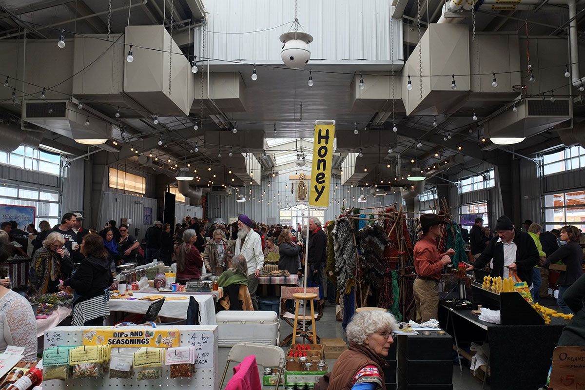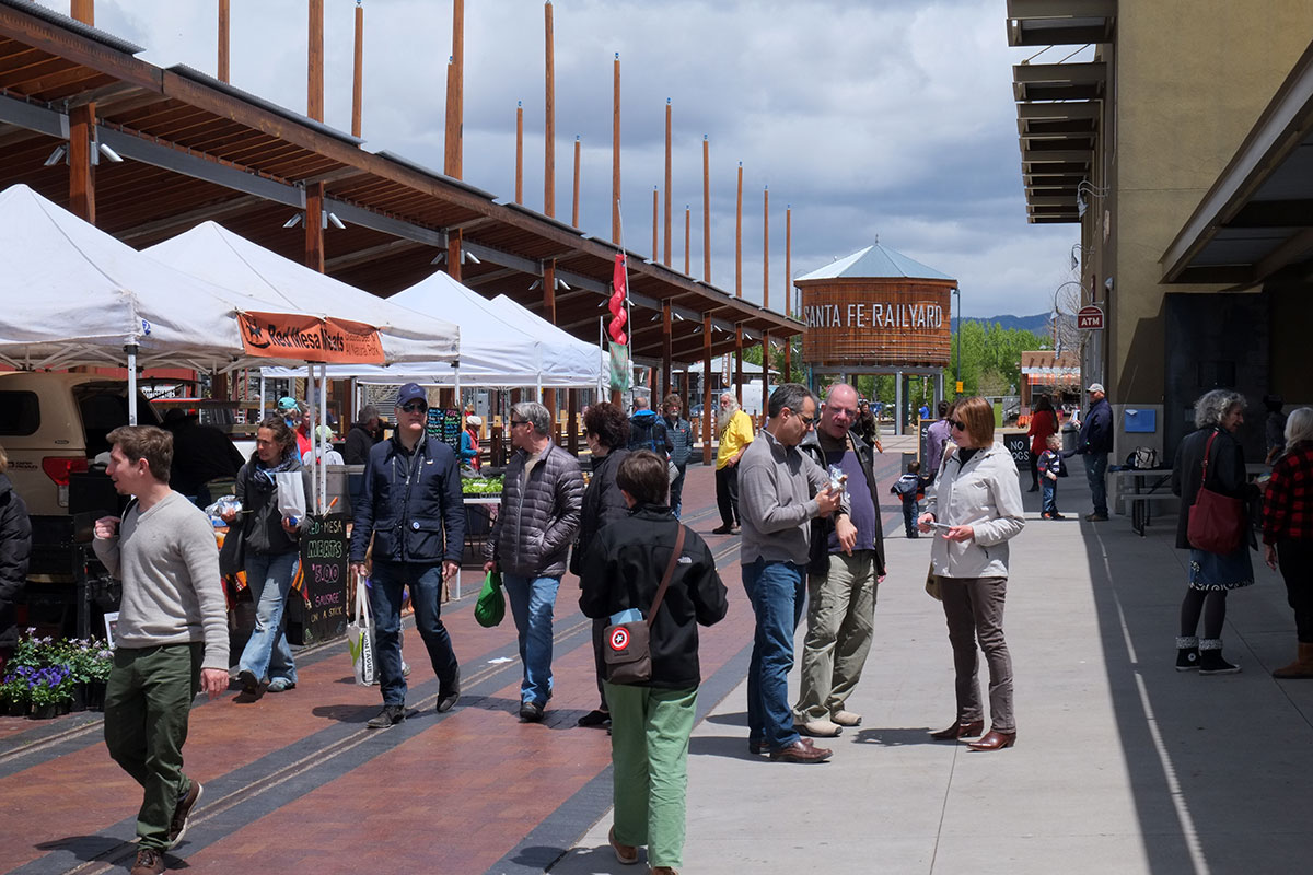 The railyard district is the one place in the center of Santa Fe where modern and industrial buildings are allowed, reasonably reflecting the historic character of that part of town and providing some relief from Adobe World. We went across the street from SITE to the Santa Fe Farmers market, and immediately felt that we’d stumbled into another one of those wormholes in the space/time continuum that we’ve been finding occasionally on the trip: we were clearly back in Eugene. It had the same range of organic foodstuffs, funky handcrafts (but with more turquoise), aging hippies (though better dressed), and new-age silliness that we were used to.DSCF9873