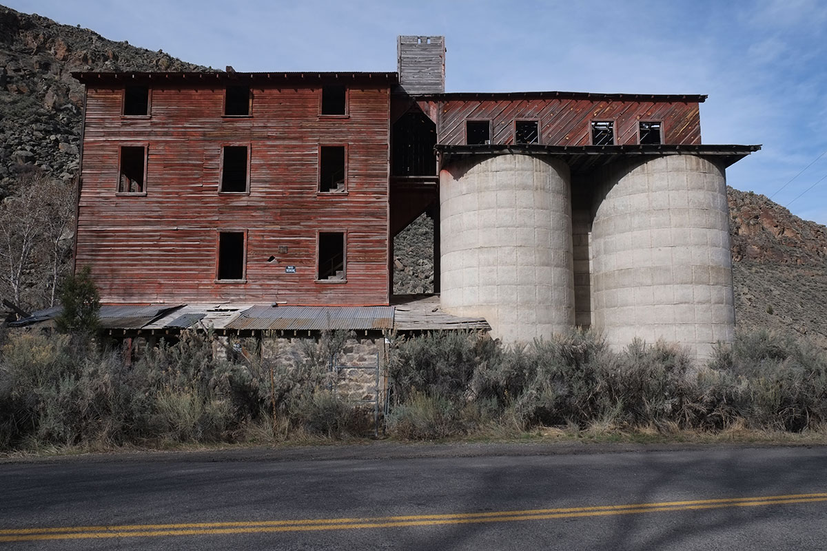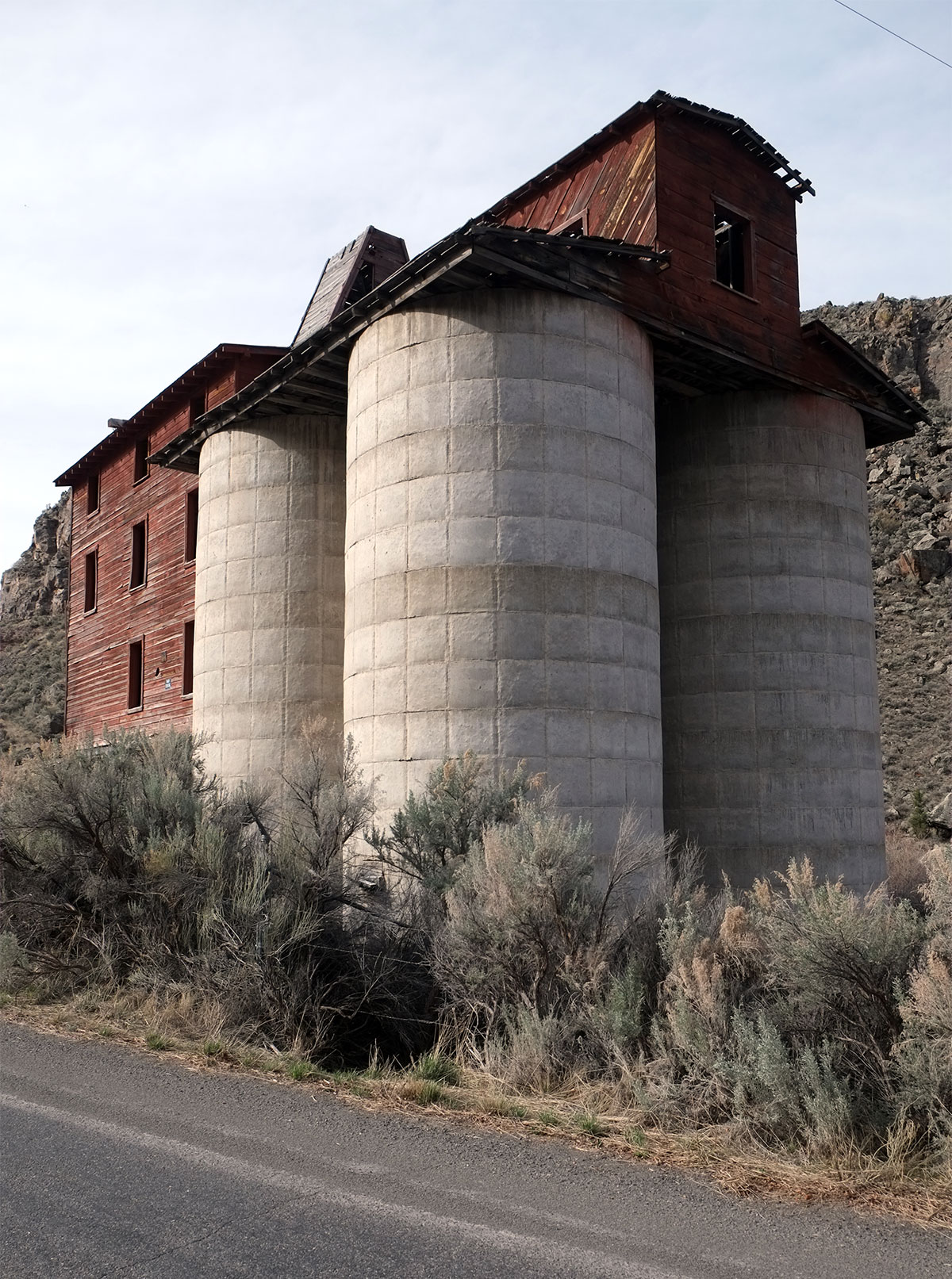 I was going to guess a mining structure, but after discovering that it’s actually in the neighboring ghost town of Osiris, Utah, I was able to find via Google that it’s the Holt Family Creamery, labeled “Holt Family Mill and Creamery” in one entry. So the concrete cylinders may very well be grain bins of the sort found in grain elevators. One web-page caption says it was abandoned ten years after construction, which is not surprising considering the marginal site.