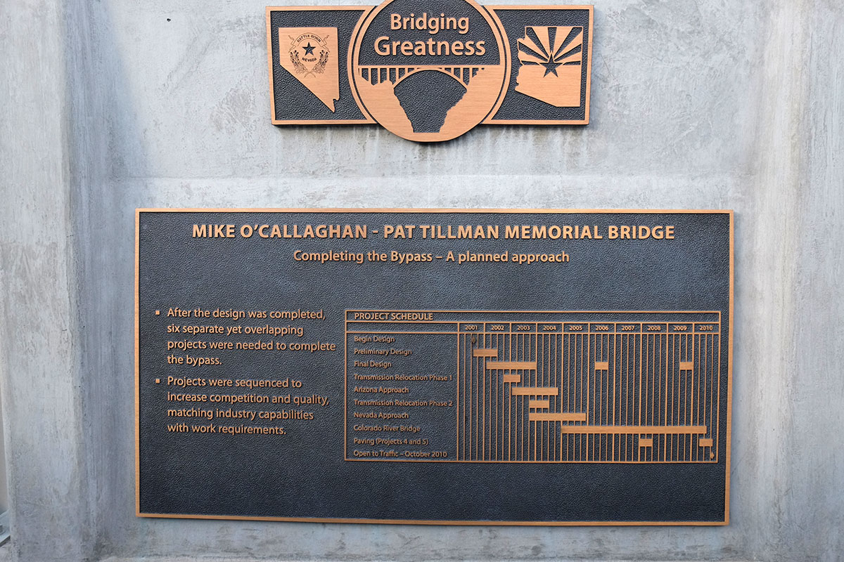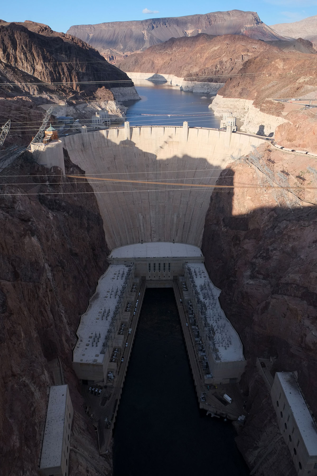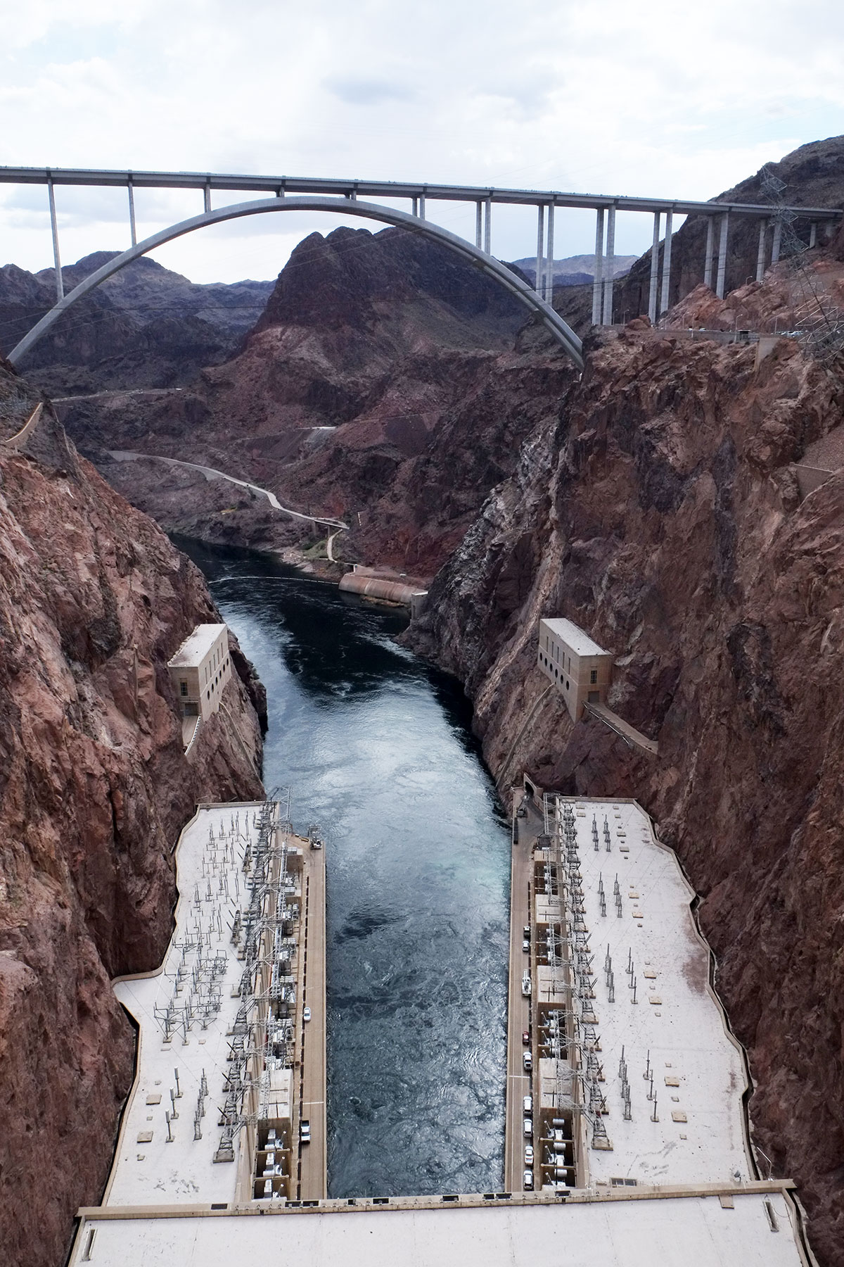The top of the dam has a two-lane roadway which used to be the main highway into Las Vegas from the southeast. But post-9/11 security concerns led to the construction of this new bridge, which carries the highway traffic. One can still drive across the dam (and go through a security check) but only to reach the visitor parking lots on the Arizona side.
