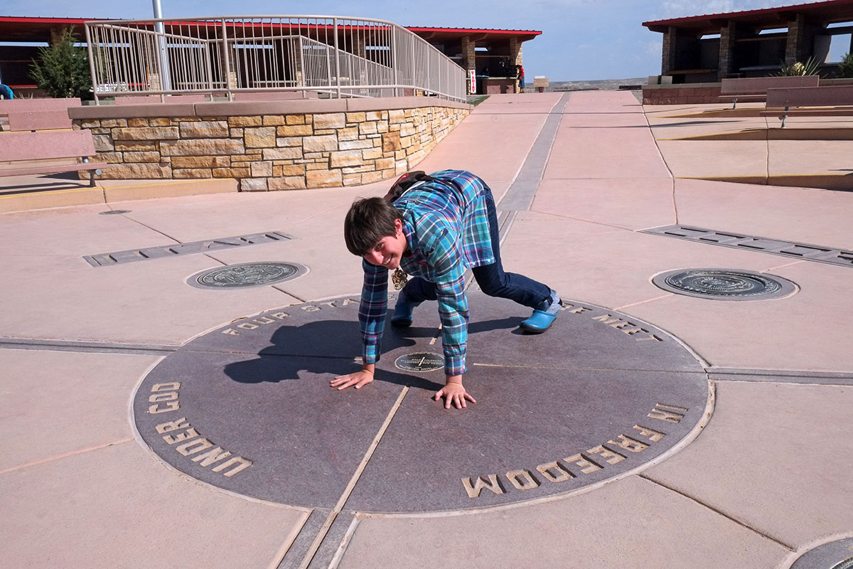 Cutting southwest at this point, through the Navajo reservation and Monument Valley, we arrived at Page, Arizona, where the Glen Canyon Dam was built across the river to form Lake Powell. Three weeks later we crossed through his area again, as it is really the only route between Canyonlands and the Grand Canyon. The second time we passed by Four Corners, where we participated in all touristically-appropriate activities. It is a place where the contrast between the natural world and the abstracted, human-made world is vividly apparent. In an area with impassable wild rivers, cliffs and deserts, the boundaries between four states are arbitrary straight lines intersecting at one point. We did appreciate the further irony that this intersection of four US states is actually in a Navajo nation park, and you have to pay an entrance fee to visit it.