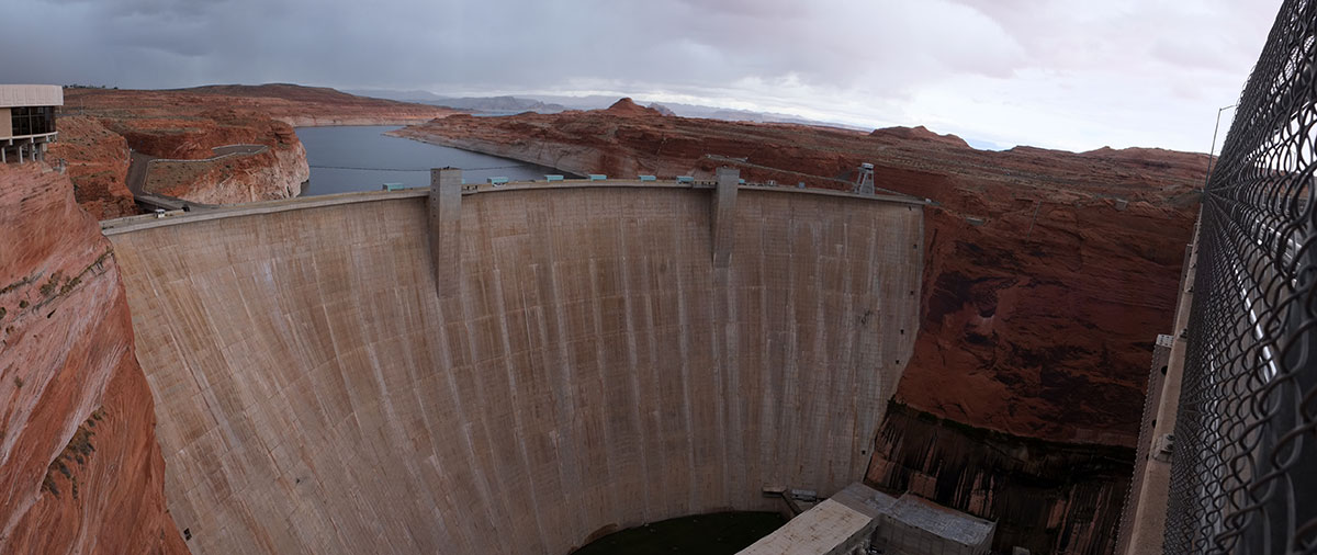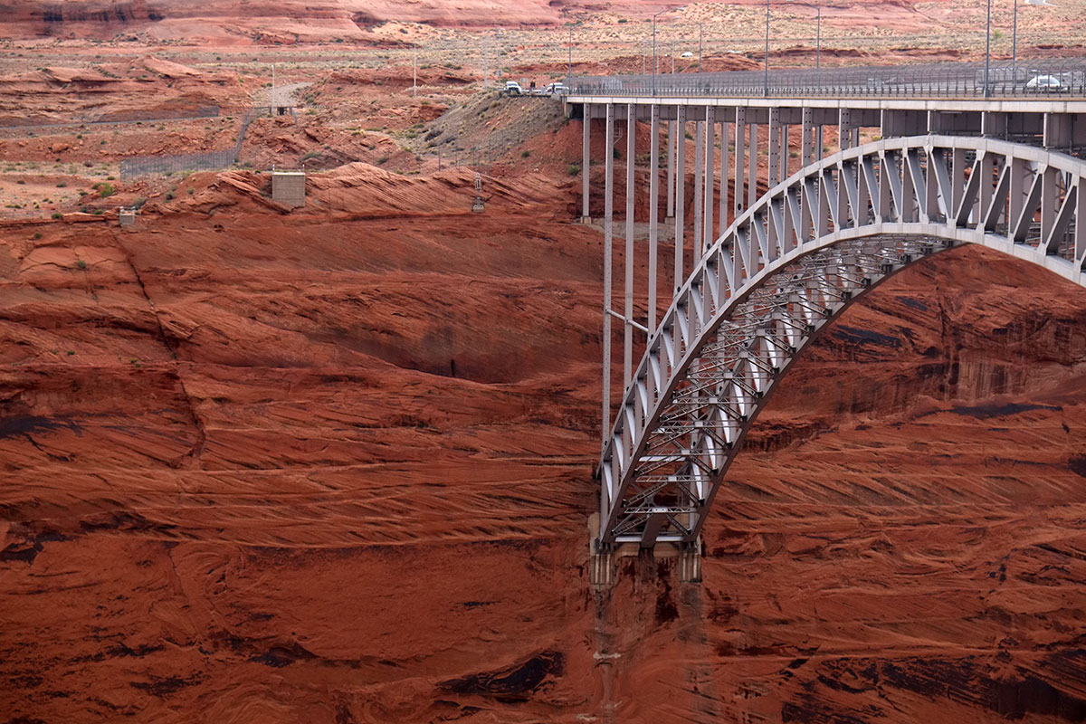 The Glen Canyon Dam was built 20 years after the Hoover Dam, and its water and power supported the great explosion of human settlement in the southwestern deserts. There is again the pairing of the dam with a separate bridge, although here the bridge was part of the original plan.