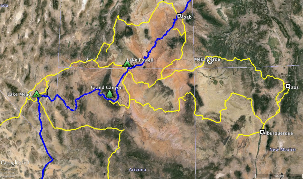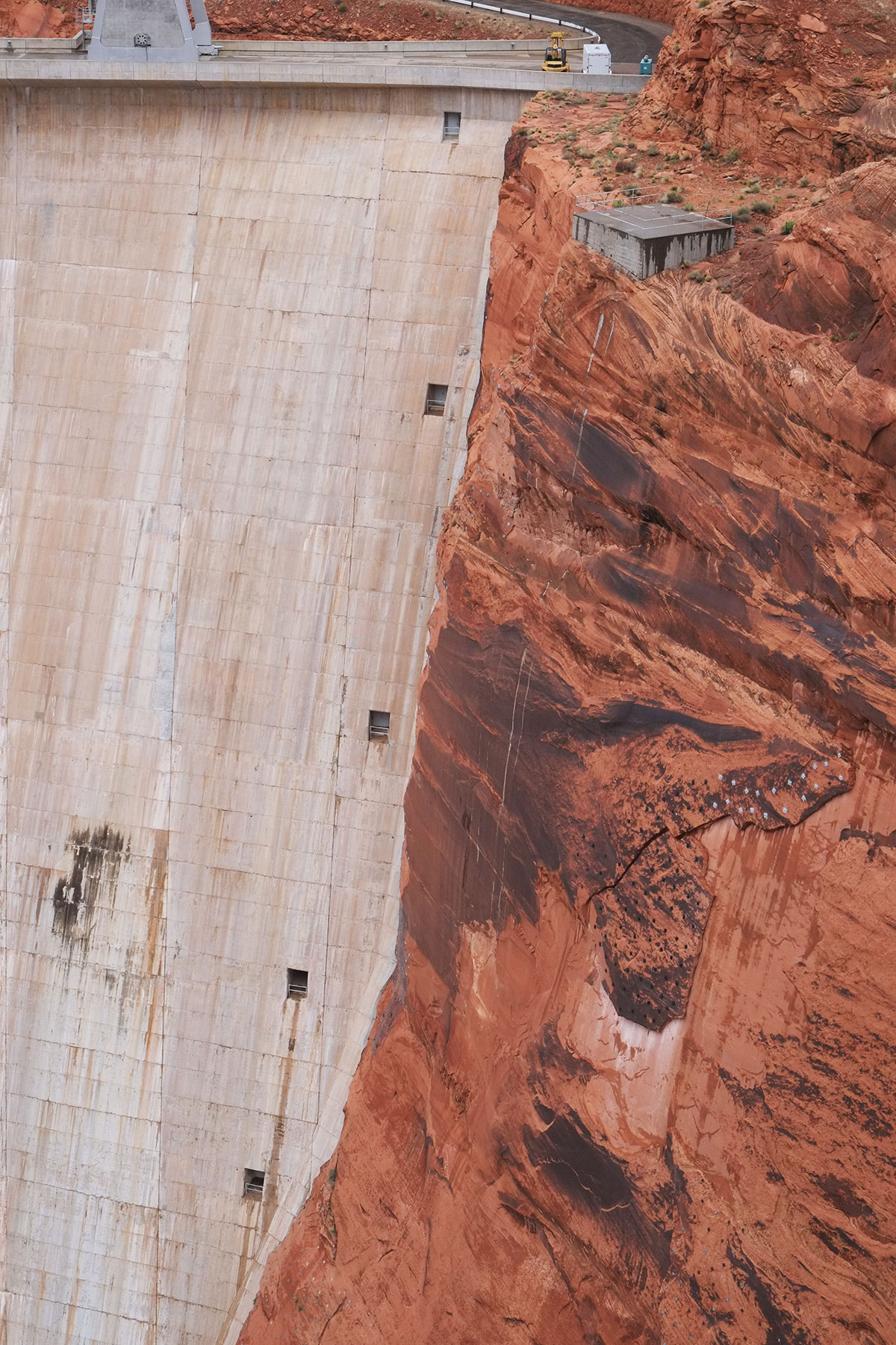 We spent six weeks knocking around the Southwest, which basically means six weeks in relationship to the Colorado River – approaching, skirting, crossing, paralleling, viewing from afar, photographing, contemplating. The Colorado and its tributaries organize the landscape on the Colorado Plateau, but unless you take a raft or kayak trip down the river, you seldom see it, as the river runs through deep canyons, across fairly impassable deserts. It touches civilization at three points – at Moab, at Page / Lake Powell, and at Lake Mead / Las Vegas. You can also glimpse it intermittently from far above at the Grand Canyon. So those of us who are road-travelling have a very different perception of the river than those who are able to make river trips. They see it as a wilderness phenomenon, whereas we only saw the river where civilization had the biggest impact possible on the Colorado – where it was dammed.