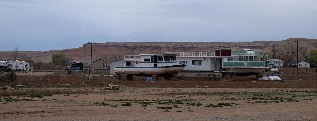 We entered the zone of influence of the Colorado again in Hanksville, Utah. It was a 40 mile drive to a launching ramp on the Colorado above Glen Canyon, so we were treated to the strange site of large houseboats stored in the desert.