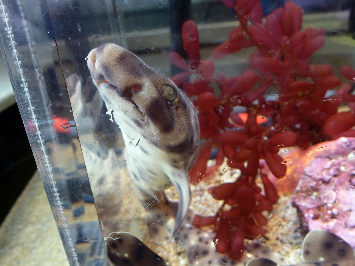 The shark and tuna exhibit had the largest single pane of aquarium glass in the world until it was topped by one in Japan. Then that broke, raining broken glass and sharks down on onlookers, and the one in Monterey Bay was back to being the largest. Sitting there in front of that giant portal into another world, I was struck by how large tuna can grow, unconstrained by gravity. They were much larger than the sharks, although they didn’t look as funny as the hammerheads, or even this baby leopard shark.