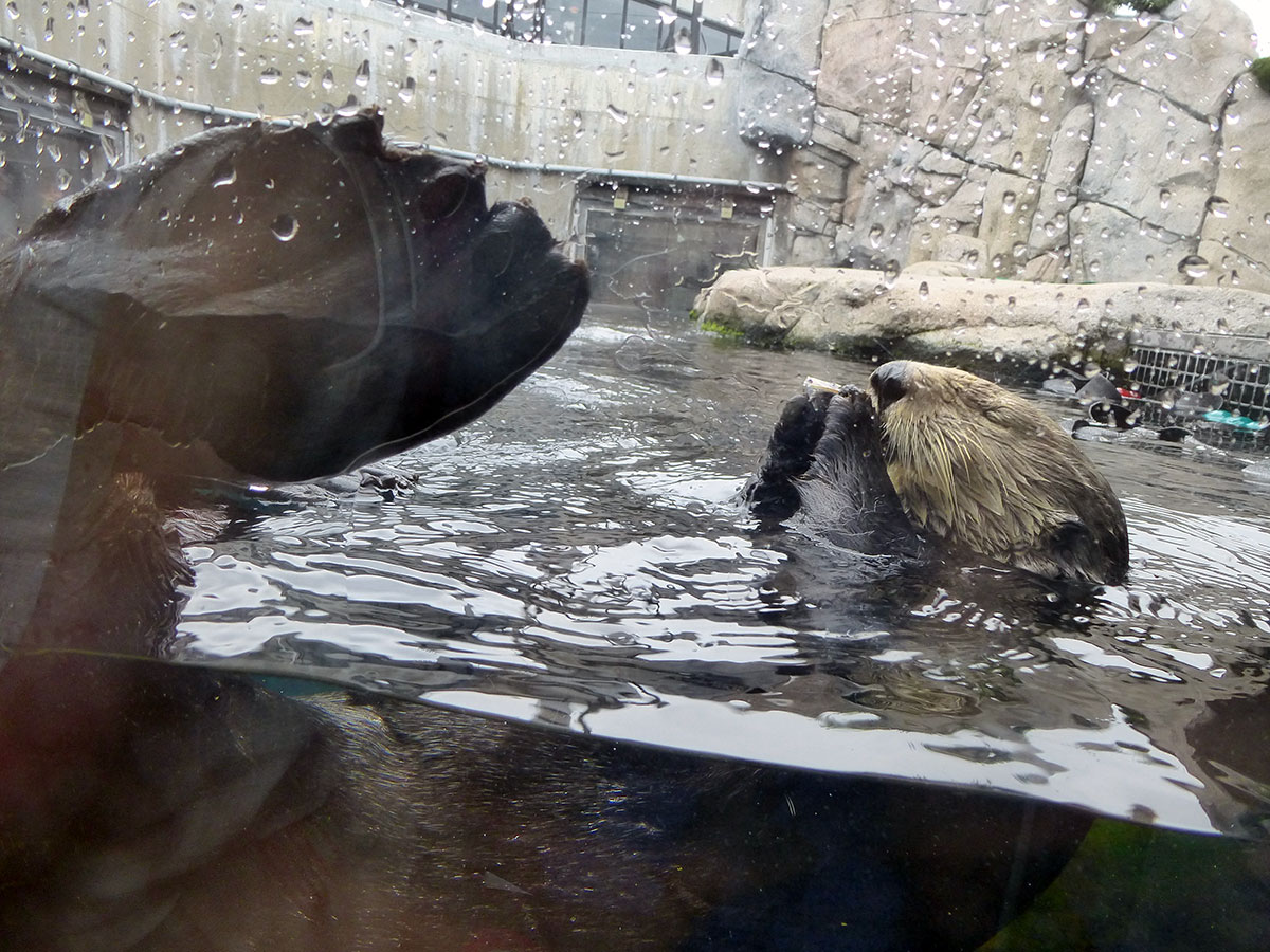 The famous sea otters were the central exhibit, the first thing you see when you walk under the fiberglass orcas hanging from the ceiling. The four females, Rosa, Abby, Kit, and Gidget, frolic under the awed gaze of visitors. Their fur, thickest in the world with over a million hairs per square inch, more than humans have on our entire bodies, keeps them dry in the cold water, but without blubber, they still have to eat up to a quarter of their body weight each day to stay warm. I’d highly recommend going to watch when they’re fed, but if you want a good view, get there at least five minutes before the scheduled time.