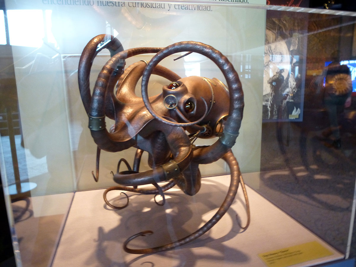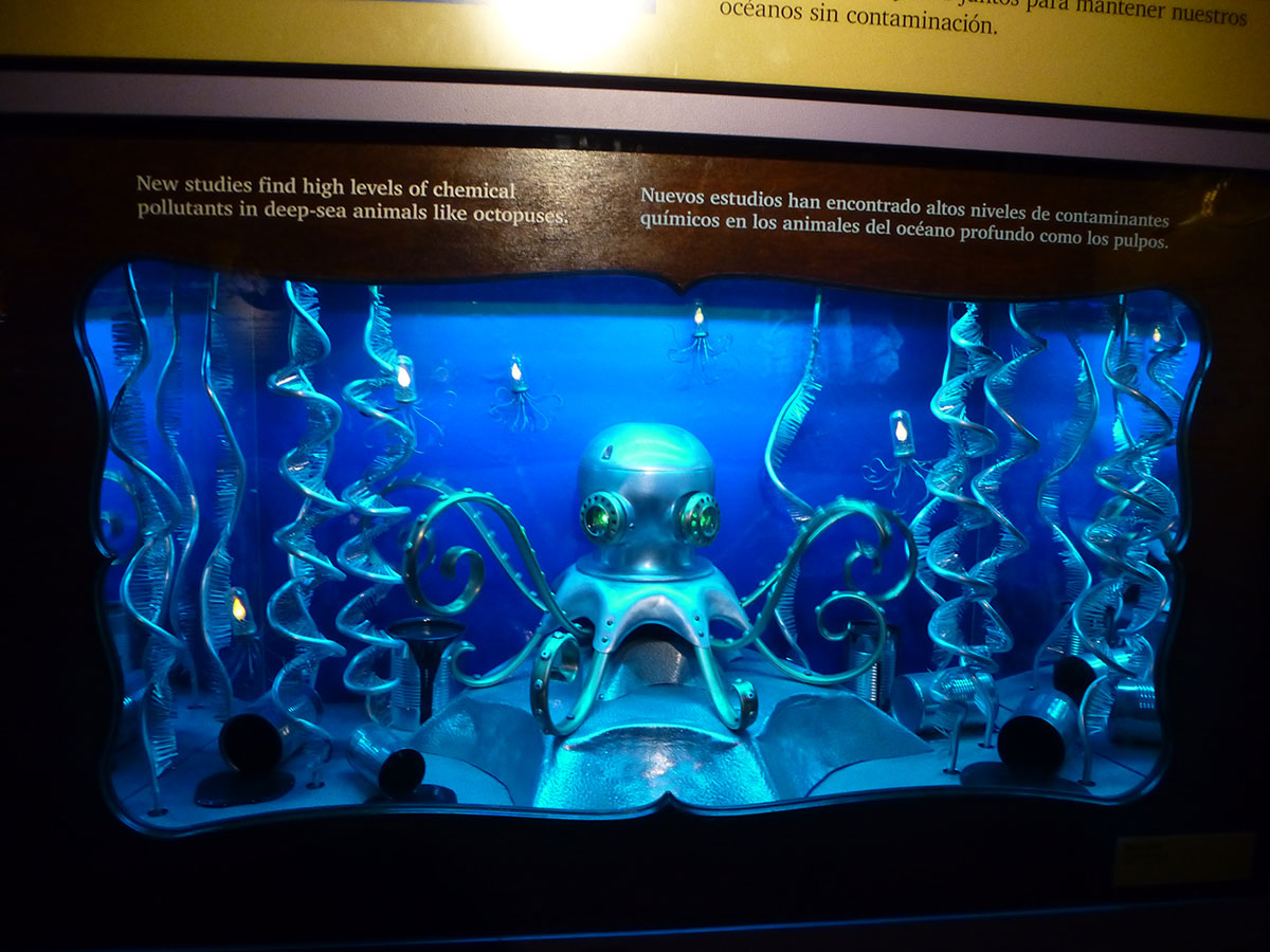 Despite their adorability, they weren’t my favorite exhibit. Once again, a temporary show takes the cake; Tentacles, the cephalopods. In the kelp forest area, the aquarium had two giant pacific octopodes (It isn’t octopi. That’s the Latin pluralization, and the word is Greek.), who weren’t hiding in some crevice for once, were cool, but paled in comparison to the variety of this exhibit. As well as the creatures themselves, it had art featuring the charismatic molluscs, including a drawing of the infamous ship-eating Kraken, painted octopus pots dating back to the twelfth century, and, personal favorite, an octopus shaped diving helmet.