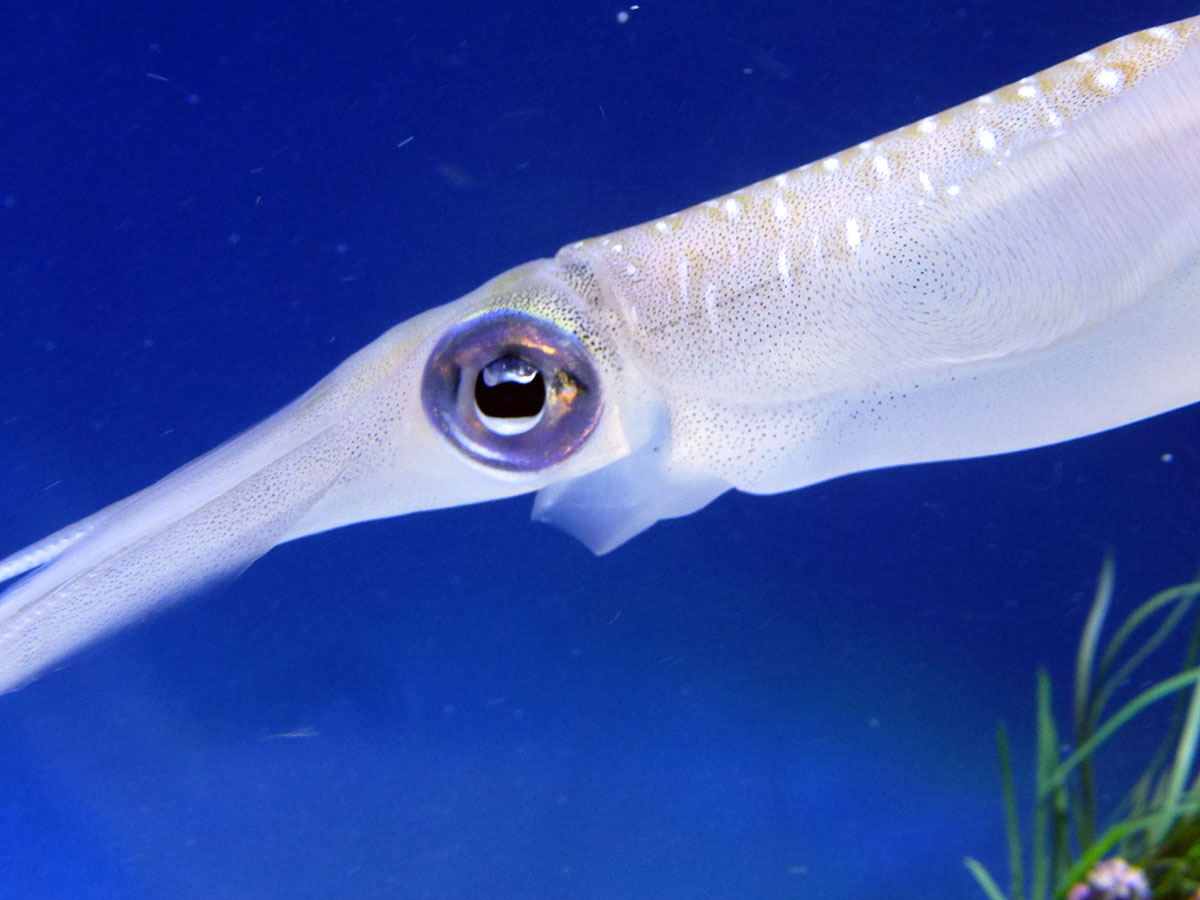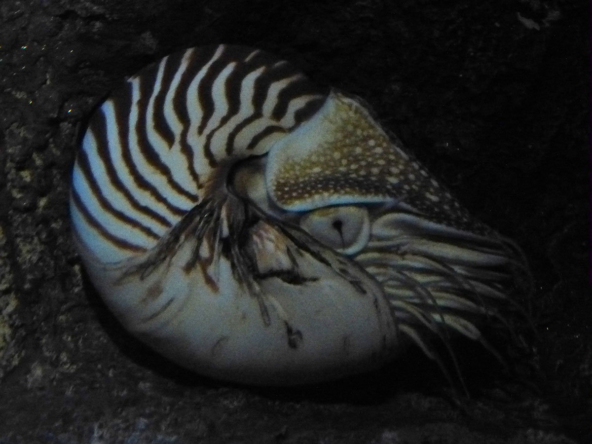 Nautiluses, the only shelled cehpalopod, haven’t changed much since the days when they were called ammonites. Large eyes allow them to see in the low light of the twilight zone, where they spend the daylight hours. At night, some ascend to the upper levels of the ocean, filling the pockets in their shell with air so they bob upward, and no one really knows why. Cephalopods are a mysterious group.