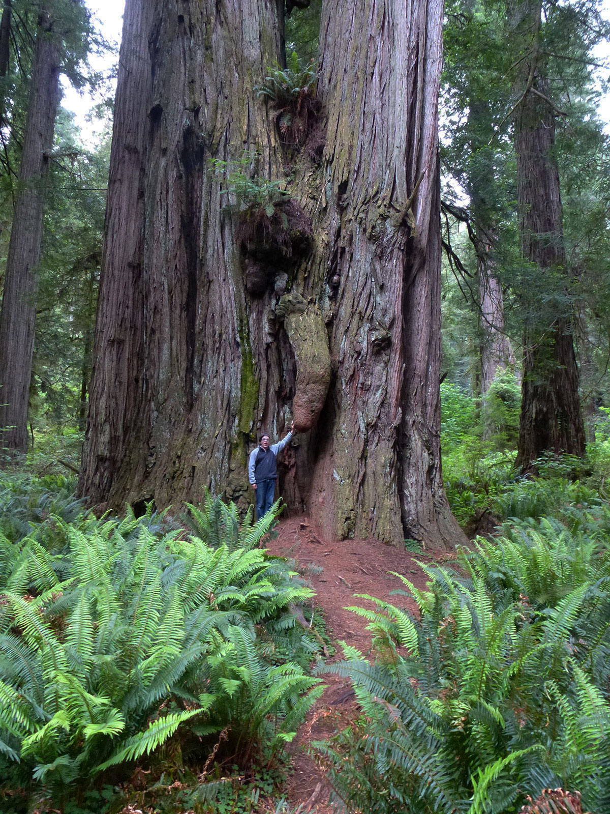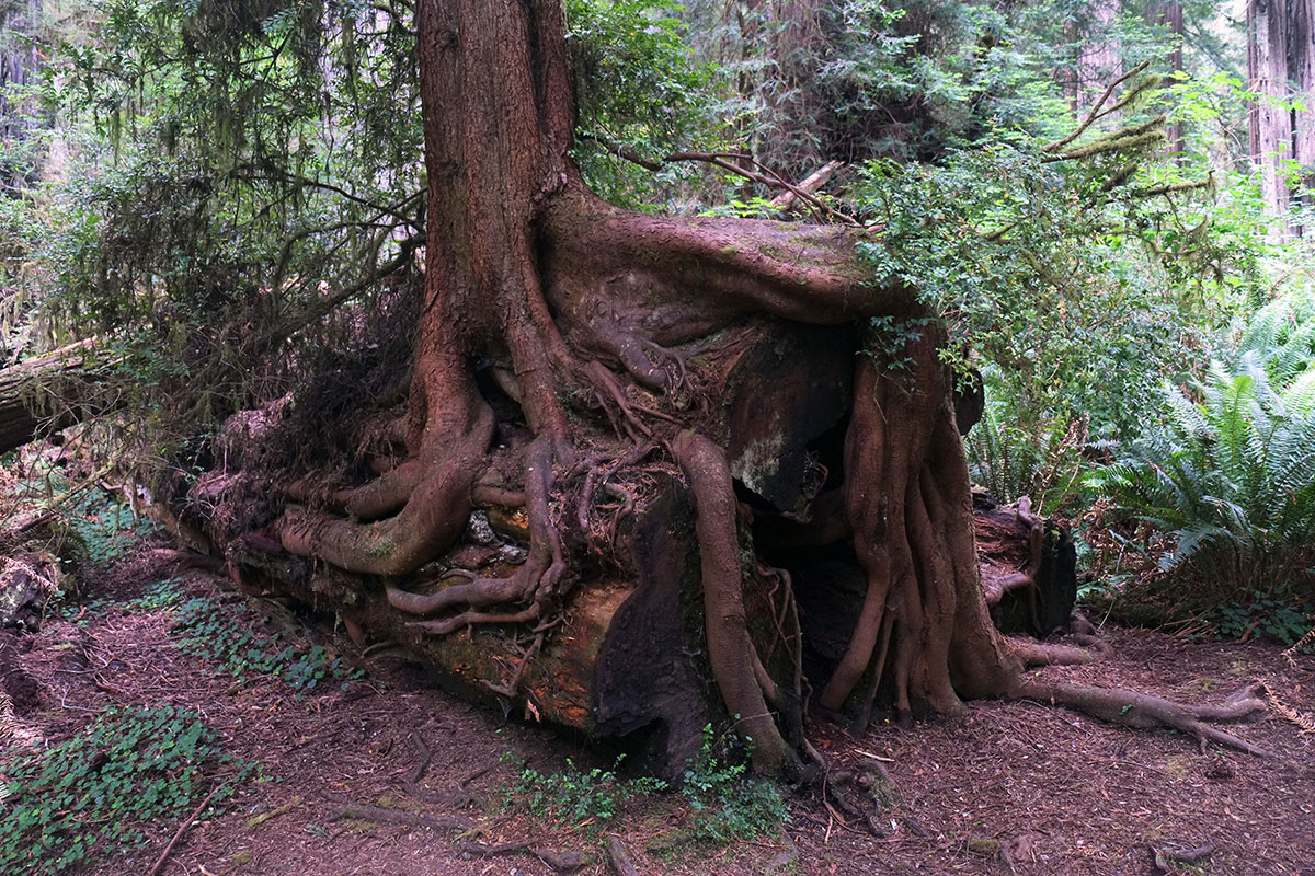 We packed up the trailer, and once again were able to avoid 101, driving on the Newton B. Drury Scenic Highway, most of the way to Klamath. There were many waysides and areas of interest, but one in particular grabbed our attention – a trail to the Big Tree. We wondered, what would it take to be called The Big Tree in this forest? Hiking along, we kept wondering, Is that the Big Tree? That one? Then up ahead of us, we glimpsed something strange through the brush.