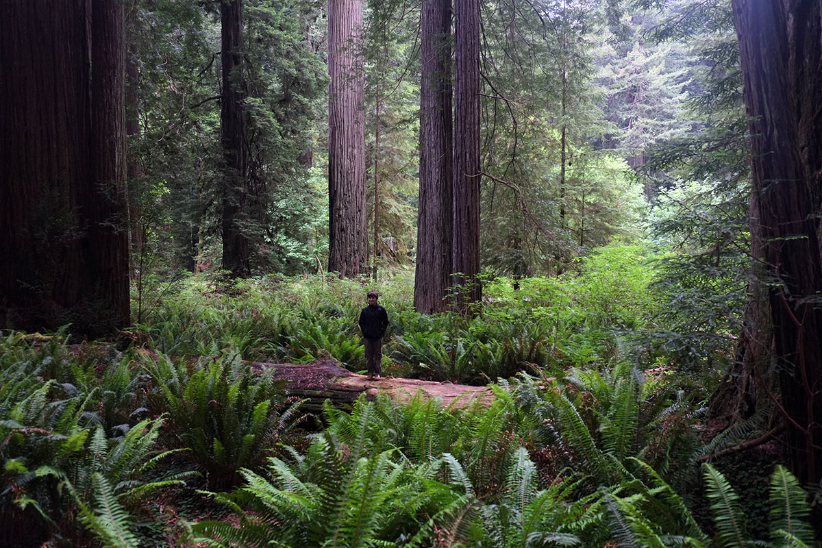 We drove into Redwood National and State Parks, a unusual designation I’d never understood, but we learned that there had been state parks here originally, which had then been encapsulated inside the National Park, which increased their area and gave them a higher degree of protection. Our campground was at Elk Prairie, where we had selected a site in the redwoods rather than on the prairie, as Greta did not want to mess with elk while heading to the bathroom in the middle of the night. It was a chilly and misty evening, especially compared to the sunny days of central California, and we ate our last trailer-cooked dinner, left over from the Mendocino Cafe.