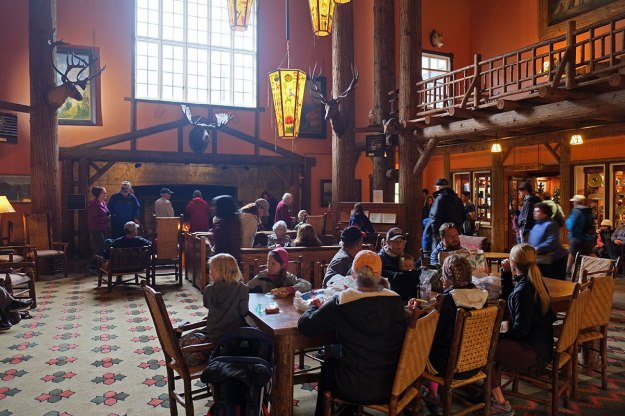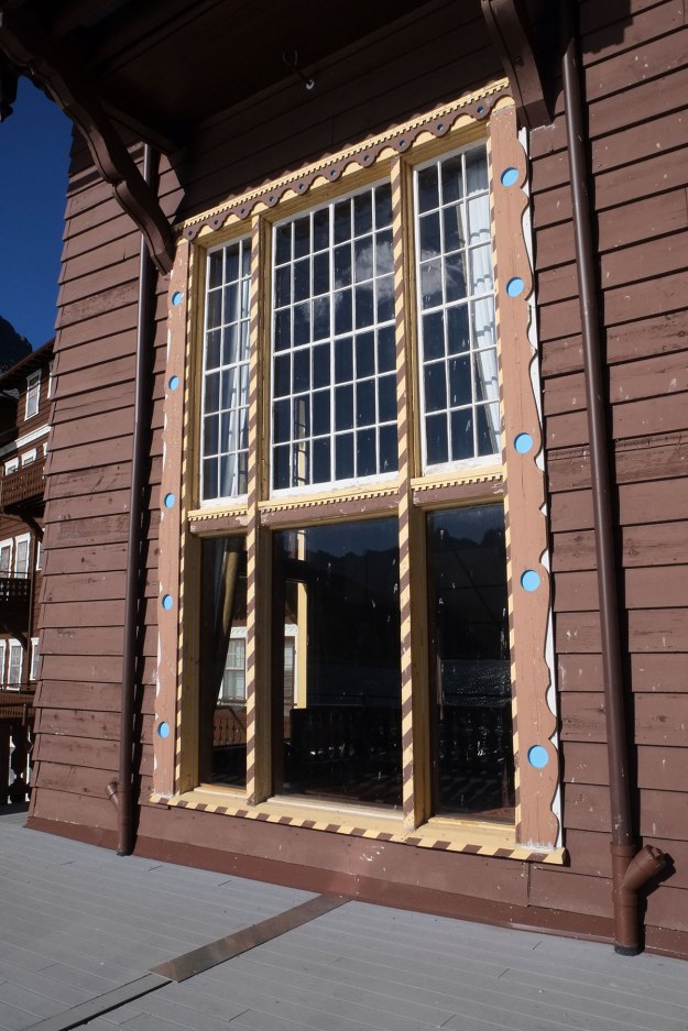 At Many Glacier, the renovated dining room is tall and beautiful, with light streaming in from west-facing clerestories.  However, this direct light must have been too much for the diners, and a pergola-like shading device runs along the western side of the room.  We couldn’t tell if this was original or not – the timbers were huge, but it seems like an unusual solution for 100 years ago.