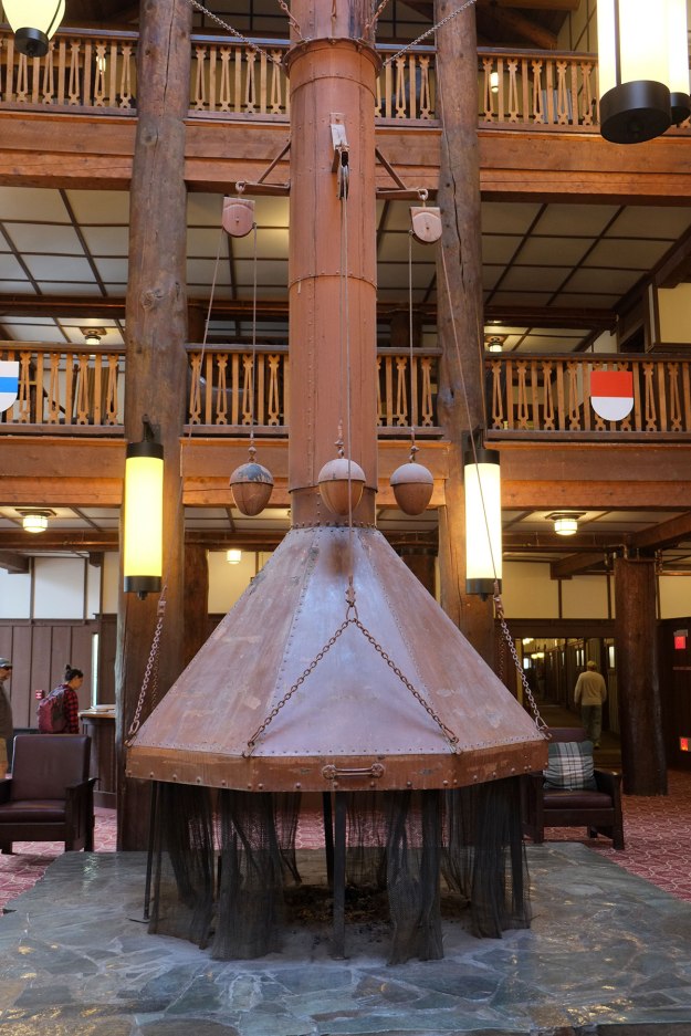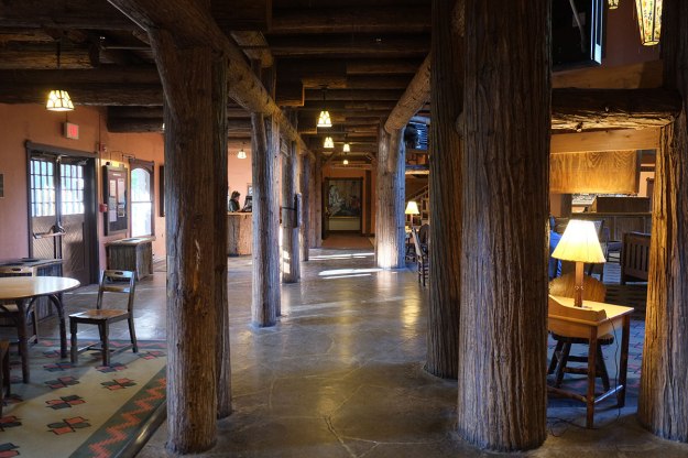 Even with the large, south-facing clerestory window above the fireplace, this atrium was dark compared to the others;  we wondered whether the large skylights at many Glacier and East Glacier had been added during renovation, and whether this degree of darkness was more in line with the original design.