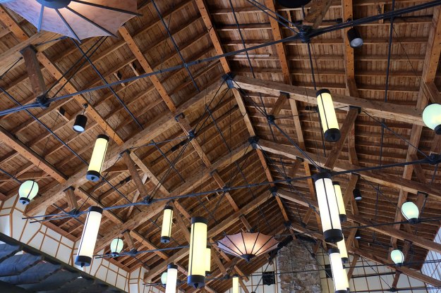The roof trusses are exquisite, with the tension members articulated as thin steel rods, while the compression members are logs.