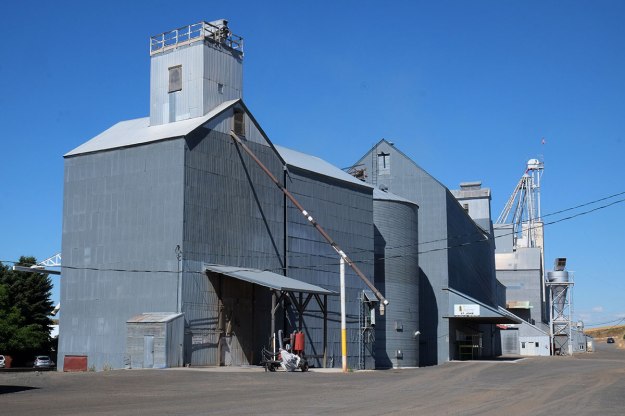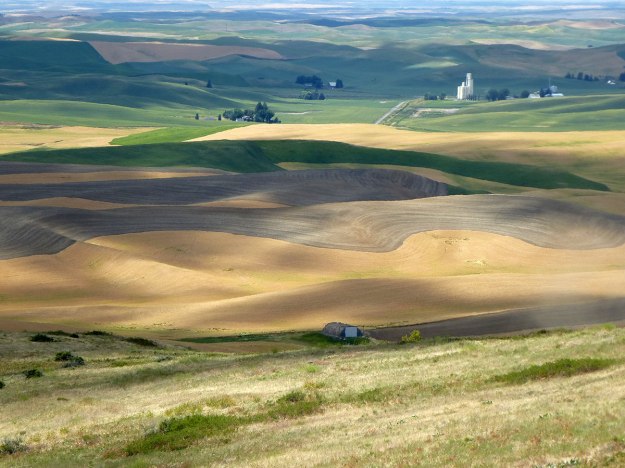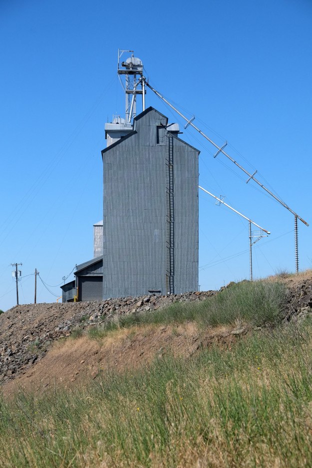 In this week’s edition of our normal finding-the-architecture-in-the-landscape, we turn to the architecture in the Palouse.  As I mentioned, the farms are so big that the buildings are few and far between.  Tom showed us a photographer’s map of the Palouse, which actually mapped all the picturesque barns, grain elevators (and even lone trees) for the region, as potential focal points for landscape photographs.  However, whatever the architecture may lack in number, it makes up for in size.  As in other agricultural areas we’ve visited before (such as southern Idaho, or southern Utah), grain elevators are the dominant type.