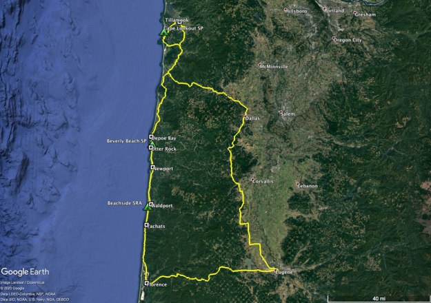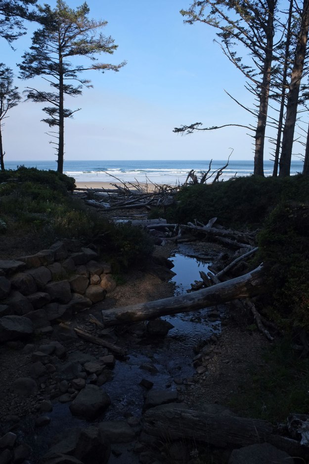 We plotted our route north from Eugene on Territorial and other minor roads, tight up against the Coastal Range on the west side of the Willamette Valley.  It was a beautiful drive on a sunny Labor Day, through farmland and small towns until Dallas, where we turned onto Route 22 through the mountains to the coast. Our destination was Cape Lookout, one of a series of rocky capes that project out into the Pacific – this one about 2 miles.  We stayed in a wonderful campground in the trees just behind the dunes, with a beautiful beach right there for walks along the Netarts Spit..This might be a good point to explain the repetitive elements and nomenclature of the Oregon Coast to those who haven’t been there.  There are a few basic classes of things:  cities & towns, rivers, capes, bays, beaches, spits, and rocks.  Each of these is named independently, usually without any reference to adjacent things in other classes, and in keeping with the general Oregon practice of having three different names for any given place, just to confuse things.  For example, if you are going to a popular destination north of Florence, you might say you were going to Heceta Head (cape, lighthouse and scenic viewpoint), or Cape Creek (river, bridge and cove), which constitute the substance of Devil’s Elbow State Park.  No matter what you called it, you would be at exactly the same place.  (And I honestly don’t know what the big rocks just offshore are named.)  To be fair, the bays and spits at the ends of rivers usually have the same name as the rivers, but it is never the same as the city that is situated at the mouth.  A state park in the same locale might allude to any one of these reference points, or something totally different.