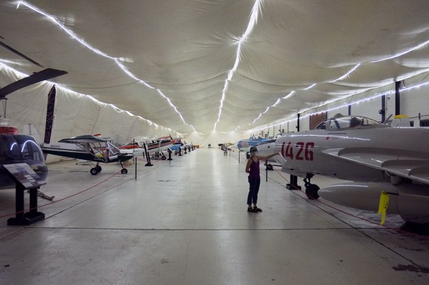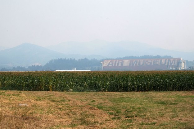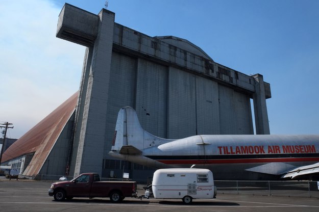 We turned north to Tillamook, home of the famous dairy whose cheddar cheese we calculated we had eaten at least a half-ton of in the past 20 years.  Outside of the town is the Tillamook Air Museum, housed in the largest wooden building in the world, a former blimp hangar from WWII.The building is spectacular – an arched vault made up of wooden trusses, with a scale comparable to sports arenas.This building had a twin, but it burnt down in 1992;  they were using it to store hay.  But now they are probably more careful, and it contains a variety of military and civilian aircraft.