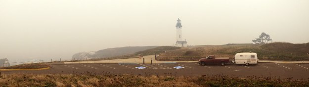 It’s a pretty eclectic collection, probably largely based on gifts.  What we really enjoyed beyond the aircraft was the random assortment of other items – tractors, cars, train engines, stored RVs, etc.  It reminded me of the Large Object Collection in Liverpool;  Liverpool had saved all this cool stuff, but at some point realized that they were never going to have the money to build a new museum, whereas they had lots of abandoned warehouses.  So they simply put everything in a series of buildings, with minimal attention paid to display and design – just let the objects speak for the themselves.  Tillamook does the same admirably.We emerged into air whose quality had degraded rapidly, and drove south on 101.  Familiar views took on a surreal quality. At Lincoln City the traffic was strangely bad, with the right lane often blocked as cars lined up at gas stations.  We later learned that a fire had ignited outside of town, and people were getting ready to evacuate if necessary.  But we continued on our oblivious way to the Beverly Beach campground, where they were clearing away the downed trees from the night before, and the sky took on what was to become a familiar, apocalyptic glow. The next day dawned even darker, and all the prominent viewpoints were blank.  We spent our time at the points that offered smaller scale, closer-up experiences, such as Otter Rock (also know as Devil’s Punchbowl.  Devil’s ____ is a favored naming convention on the coast). It was surreal, like being trapped in a photo album of 19th century tourist sepias.  Between the demands of social distancing, and the general eeriness of the day, we avoided the inhabited areas as much as possible, sticking to beaches and campgrounds.  Yaquina Head was devoid of other tourists, and we had it all to ourselves (along with the flies).On Wednesday afternoon we first heard of the Holiday Farm fire centered on the McKenzie valley just east of Eugene.  It had grown to over 200 square miles in the two days since it started on Monday evening.  We considered heading home immediately, but realized there was little we could really expect to do, that the heat and smoke would be worse in Eugene, and that we would either be homebound or evacuating in the near future, so we might as well stay one more night.  We walked on Agate Beach, ate clams in Waldport, and spent the night at the Beachside State Recreation area, where we slept 100 feet from the beach, and listened to the surf through the night.