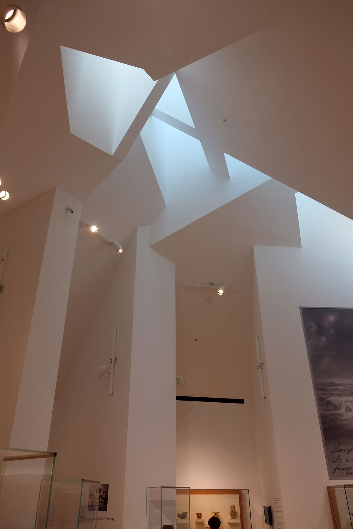 Greta spotted two inconspicuous windows in a wall, and came across this – a view inside thewall, showing where the original rear façade of the museum now faces the partition wall of a new gallery. This is not a building which has much tectonic expression, and this little view perfectly illustrates something Bob Stern once said. We were all enamored of the clarity of the exposed systems in Kahn buildings, and Bob asked, do you have any idea how much round stainless steel ductwork costs? His proposal was that the rational way to make a building was to design the spaces you want, enclose them with steel studs and gypsum board, and then leave lots of poche space where the engineers can insert anything they want. So in a building where that is basically the model, it is instructive for Snøhetta to give us a glimpse behind the curtain.