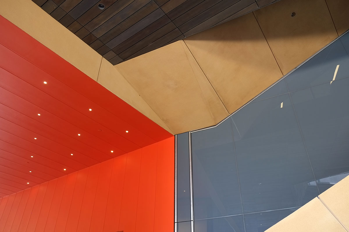 is maintained by the wall of the new addition. This façade is mostly flat panels, with a slice at the top left corner which gives a hint of the swoopy rear façade.