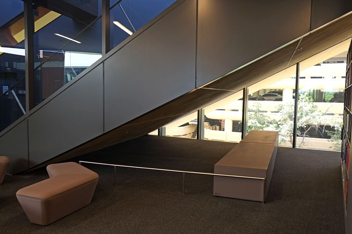 More evidence that European architects and American building code officials do not play well together. Here, where the curving façade slopes in above the top of the stairs to the seventh floor, someone noticed (probably very late in the game) that if you stood right up against the handrail, you could bump your head. So the solution is a lower guardrail which keeps you in the zone where there is legal headroom, perhaps the clumsiest solution to an ADA problem I’ve seen since the Seattle Public Library. If the EU would pass a Europeans with Disabilities Act, we wouldn’t have these problems.