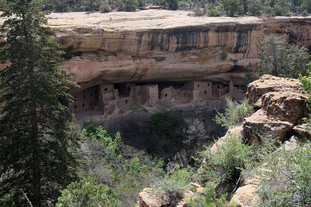 The most-visited ruin is Spruce Tree House, misnamed after the large trees which grew in front of and sheltered it, which were actually Douglas Firs (obvious to northwesterners). The pit house settlements at Mesa Verde were on the canyon rim, and the cliff villages are right below the rim, and accessed from above. Normally one can hike through this village, but a large piece of stone detached from the arch a little while ago, and so we couldn’t go in.