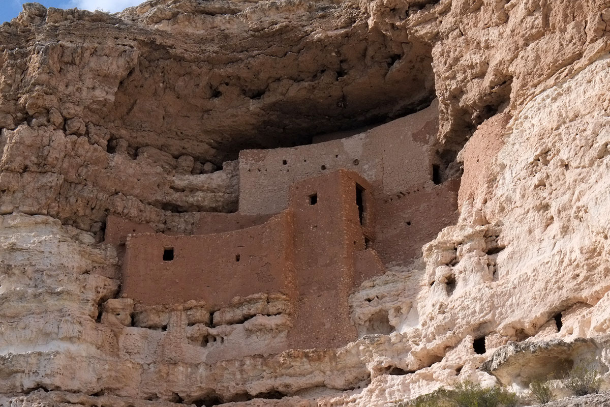 The first cliff dwelling I ever saw was Montezuma’s Castle (about an hour north of Phoenix), twenty years ago. It is the picture-perfect cliff dwelling, the small enclave for a few families, tucked into a small arch in a canyon wall. Different buildings have differently-colored masonry, so it is easy to imagine them as individual houses, rather than one large complex. Montezuma’s Castle is the dollhouse version of a cliff dwelling, the one a small child might draw.