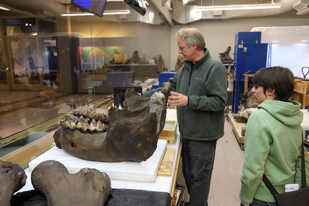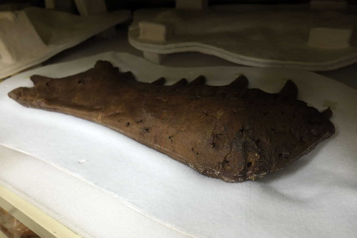 the jaw bone from the first identified Tyrannosaurus Rex, in the storage locker.