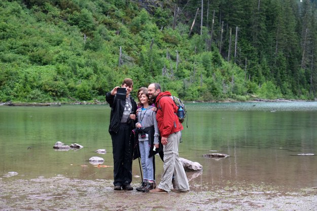 St. Mary Falls was pretty crowded, and we began to understand the demographic of summer visitors to Glacier.  On our trip three years ago, we learned that when you’re camping in the South in the winter, you’re surrounded by retired Northerners.  This time we found that when you’re camping in the North in the summer, you’re surrounded by extended families of Southerners (and some Midwesterners).  In the Fish Creek campground, there were many multiple-RV encampments of connected households, who had travelled in convoys from their hot, humid homes.  They all seemed to have at least four kids, and the womenfolk tended to domestic tasks, while the guys messed with their RVs and giant pickups, and the kids rode their bikes in circles and ran amuck with sticks. Then they would all organize themselves, and head off on a short group hike to a noted destination.
