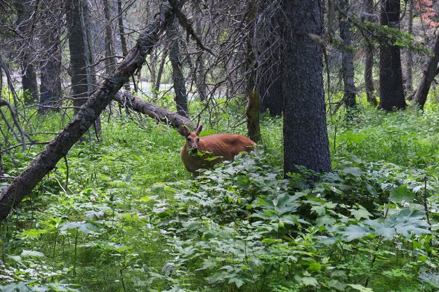 Swiftcurrent Lake is circled by an easy trail, on which we kept our eyes open, as we had seen two moose there a few days before, and passing hikers told us of spotting bears.