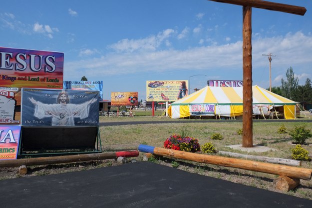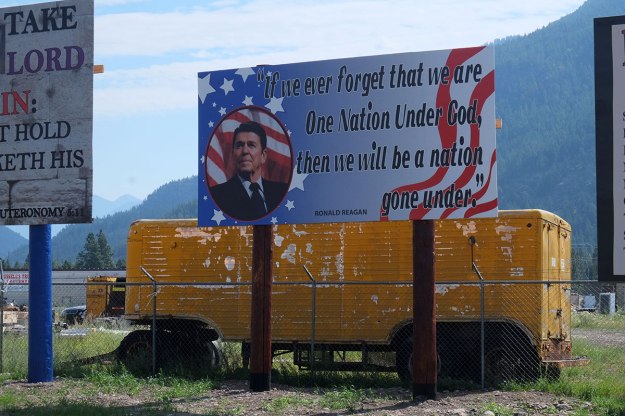 On our way to West Glacier, we had passed this “Ten Commandments Park”, which seemed to follow the Stations of the Cross format, but with the Ten Commandments, and on billboards.  Greta was adamant that we had to return to examine it in more detail, as being a secular Eugenean, she doesn’t get to see religious zealotry too often.  Her willingness to explore the venue stopped short of wanting to engage the proprietors in conversation, especially after she spotted the “Make Jesus Legal Again” bumperstickers.