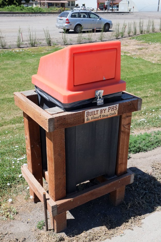 Driving through Plains, Idaho, we came across a whole street with these regularly spaced garbage cans, each enclosed in what we assumed were cages to keep them from blowing away in the winter.  We especially liked the plaque on each one, pointing out that it had been built by Mr. Friesz’s Shop Class.