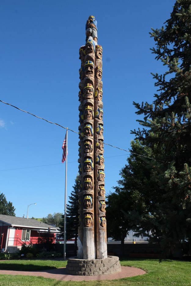 By far the greatest roadside attraction we came across was the Codger Pole, in Colfax.  It is the tallest chainsaw sculpture in the world (so they say, and I believe them), and it commemorates two important moments in the town’s history.
