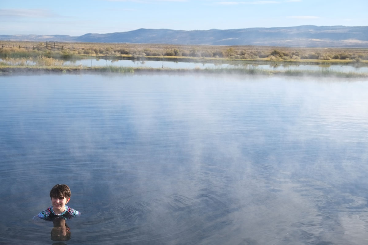 It had been dark, raining and muddy as we went to sleep, and we awoke to sunrise in the high desert, the kind of dawn where everything seems serene, beautiful and full of possibilities. I wandered over to the campground store to buy some milk, and everyone I met was happy and helpful. Greta and I sat outside eating our breakfast, marveling at the light, the atmosphere and the mist rising over the pond. I asked her if she wanted to sit in the hot spring or whether we should just get going, and she said, I think we need to have the whole experience. So we dropped into the pond, found the hot water inlet where the temperature was higher, and just lolled around, watching the ducks paddling at the far end of the pond. I asked Greta where she’d be if we weren’t here, and she grinned that she’d be in math class.