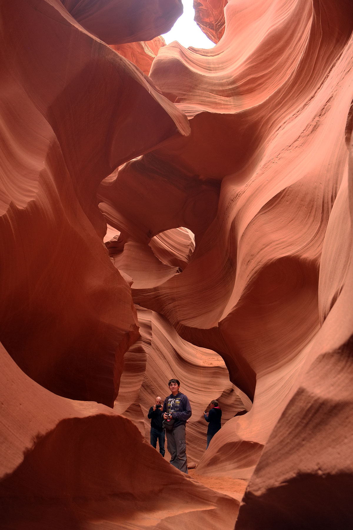 It is absolutely the most surreal place we have visited. It makes Bryce Canyon look normal. It is a very narrow slot canyon, eroded by Antelope Creek (which empties into what is now Lake Powell, where the Colorado River has been dammed by the Glen Canyon Dam), and also by the wind blowing through. Many people don’t know about it, since it has only been open to the public for about 20 years. It is part of the Navajo Nation park system, and you have to go on a guided tour, of either the upper or lower canyon. When it was first opened, guides were not required, and a group of 11 hikers was killed by a flash flood. Since then, guides with walkie-talkies lead tours, and know how to get you out if a flood appears. They also have rope ladders positioned along the top, which can be thrown down in an emergency.