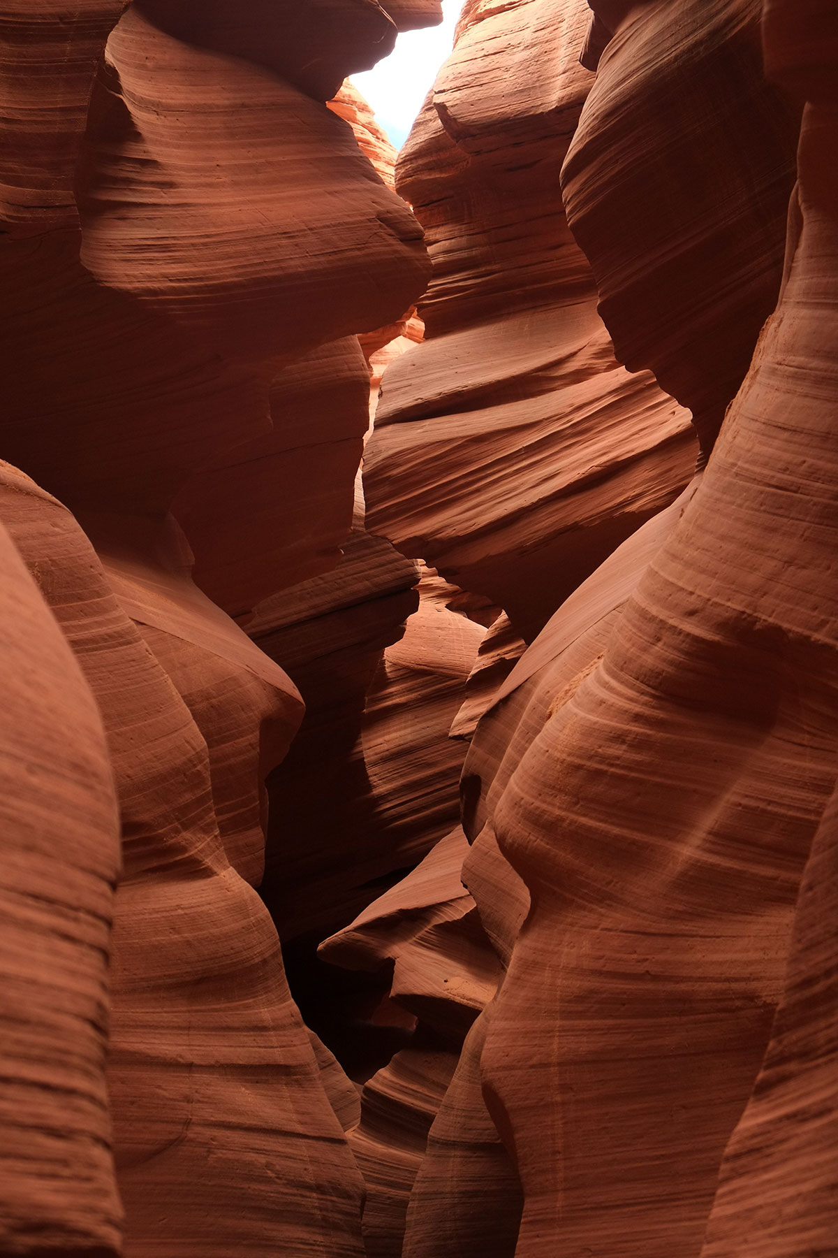 One of the aspects that makes it such an astonishing place is that the experience changes with every step. When you look at a big landscape element – such as the Grand Canyon or a mountain range – from a distance, it always looks pretty much the same, even if you travel a few miles. Antelope Canyon is a landscape at the scale of architecture – as you walk through, your perspective is always changing, and new vistas appear, the light and shadows change dramatically, people in your group disappear around a bend. The photographs might be beautiful, but can’t begin to capture the spatial experience of being surrounded by sculpted stone and moving through it.