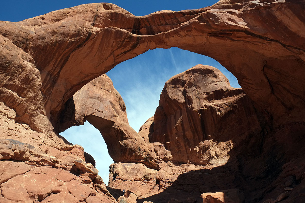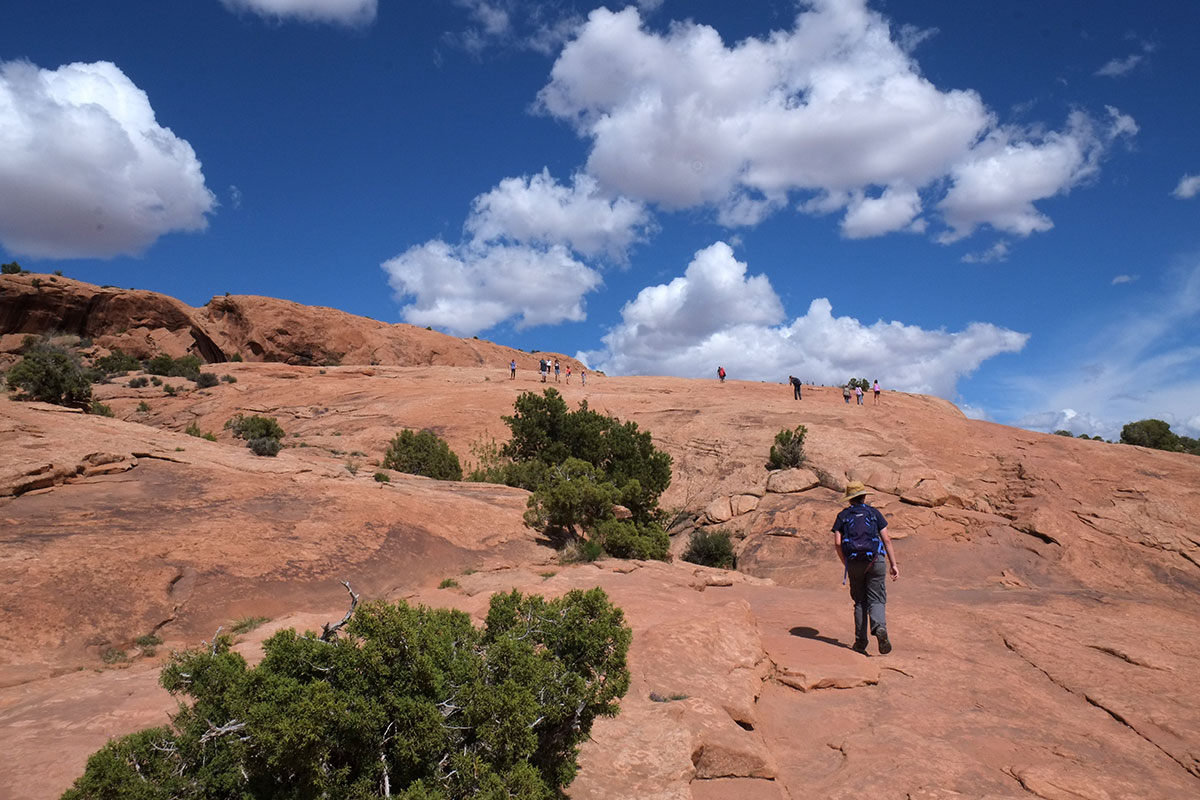 We spent a few days hiking in the park with that approach, for which the park is well-structured.  There are a few arches which can be viewed from car-accessible overlooks, but most of them require hikes with easy to moderate demands.  The hikes were superb – lots of scrambling on slickrock, and at the end of a few miles of enjoyable activity, there was the payoff of the arch.