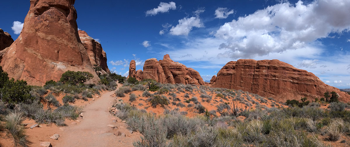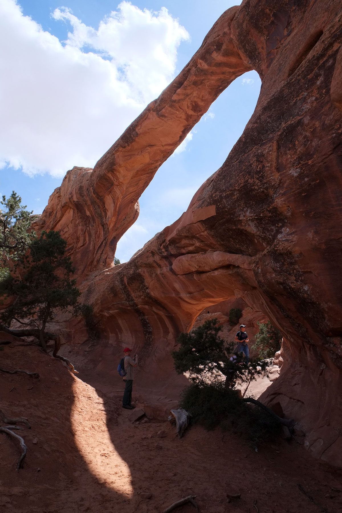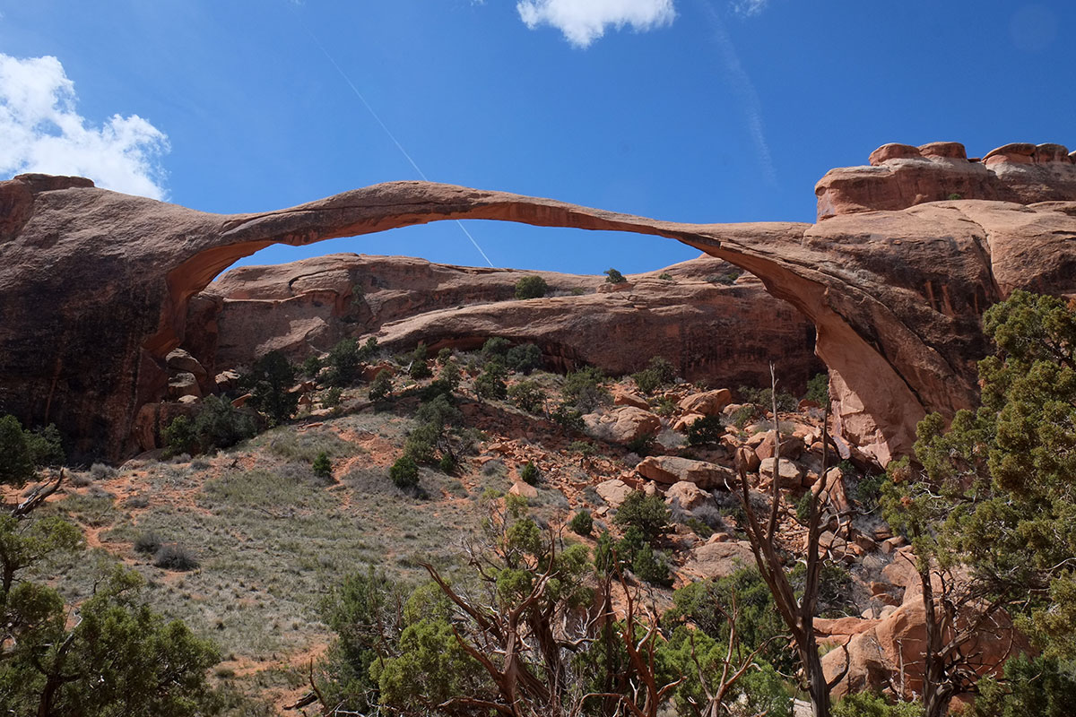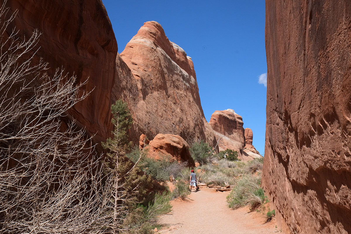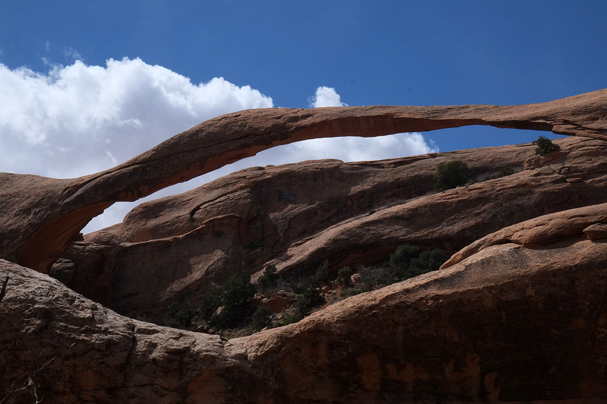 and then opens out, closes, in, constantly revealing different vistas DSCF7870The first big arch on the trail is the Landscape Arch, the longest and most delicate in the park, about 300 feet across.  DSCF7876