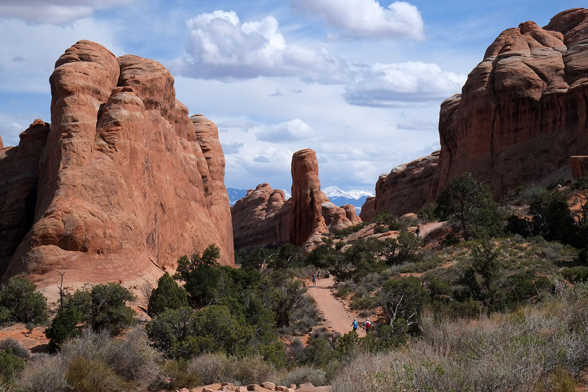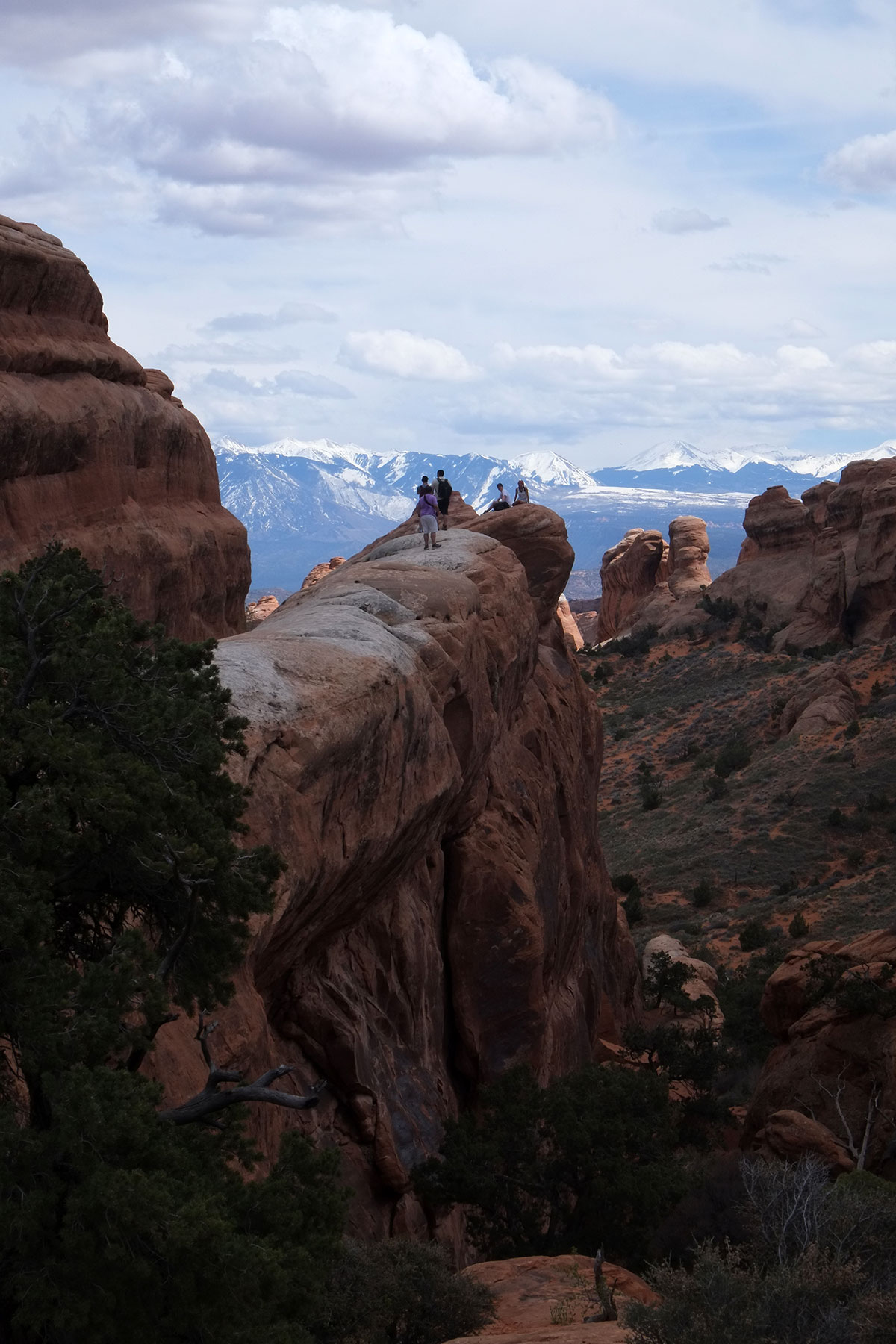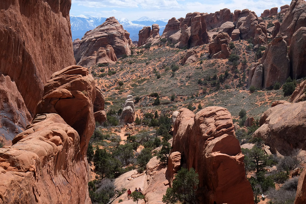 At this point on our way back, we did our good deed for the day.  We were asked by some middle-aged hikers whether the rest of the trail was easier or harder, as one of their group had vertigo.  We told them it was a lot more precipitous, and so we saved her from getting to this point.  DSCF7920 The rock formations in this area are big fins, DSCF7940and part of the trail runs along a fin ridge.  Greta as scale figure in the landscape once again, with the La Sal Mountains in the background.  DSCF7928