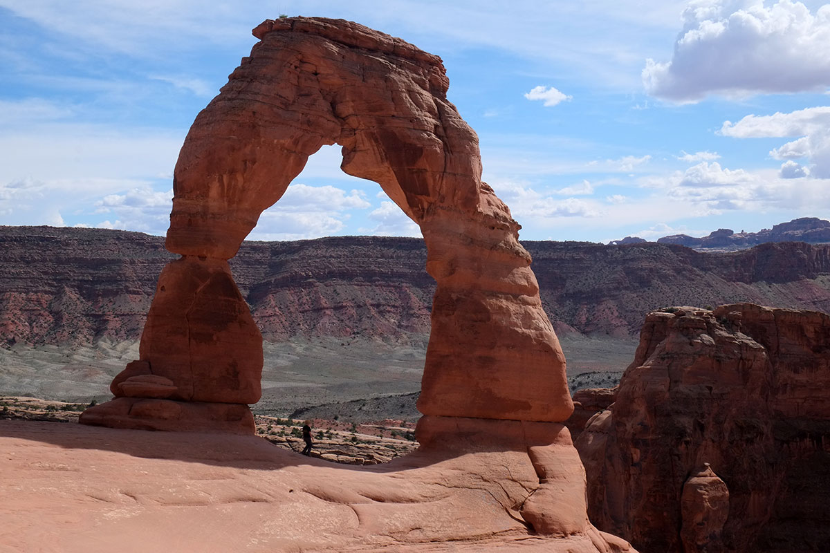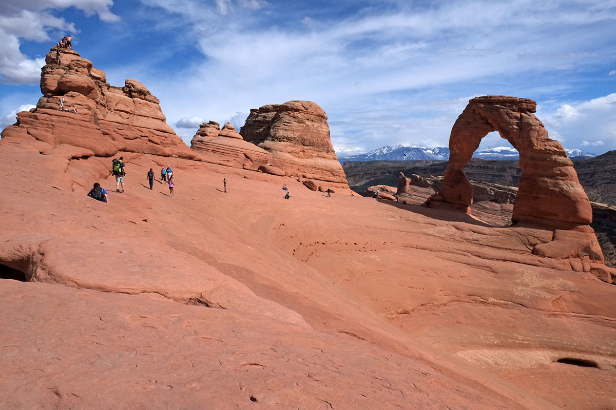 Delicate Arch is freestanding at the top of this rock bowl.  The people walking towards it in this photo are on a slightly-sloping surface, and the slope increases continuously towards the bowl to the right, to the point where you might find yourself on a rock face that is just too steep, facing a drop of hundreds of feet below you.  We all watched as one woman dropped her water bottle, and started to go after it until she thought better of it.  The bottle rolled back and forth on the slope, picking up speed, and then finally bounced to the bottom of the bowl.  DSCF7976