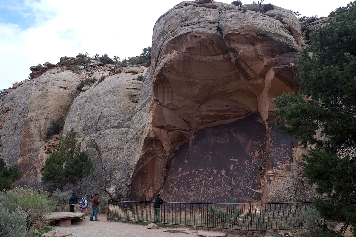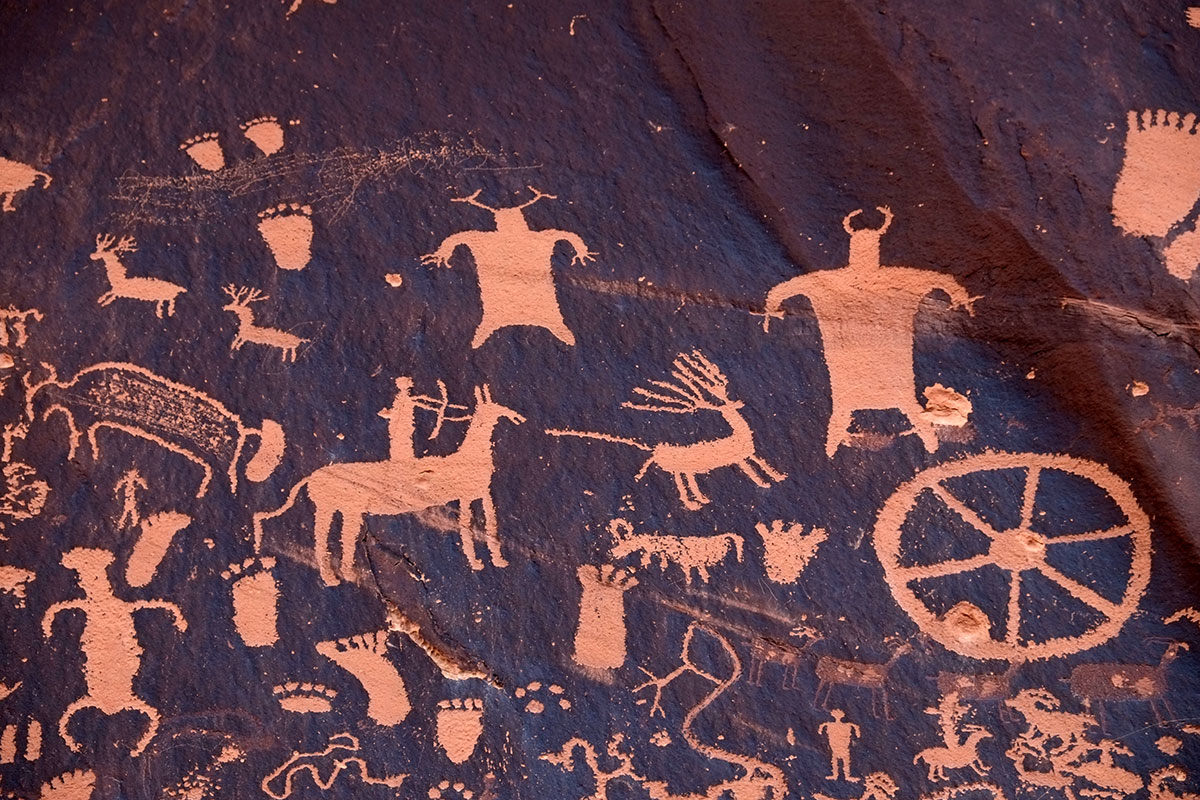 So we took the daytripper approach, driving in from Moab until the pavement ran out, and taking a few short hikes around. (We were still in altitude-wary mode, after the Zion incident.) First we came to Newspaper Rock, which is a large outcropping covered with petroglyphs. No one is sure when these images were produced, or over how long a period. Our attitude towards them is similar to our attitude on geology – we just don’t care to learn that much about them, we just think they’re cool.