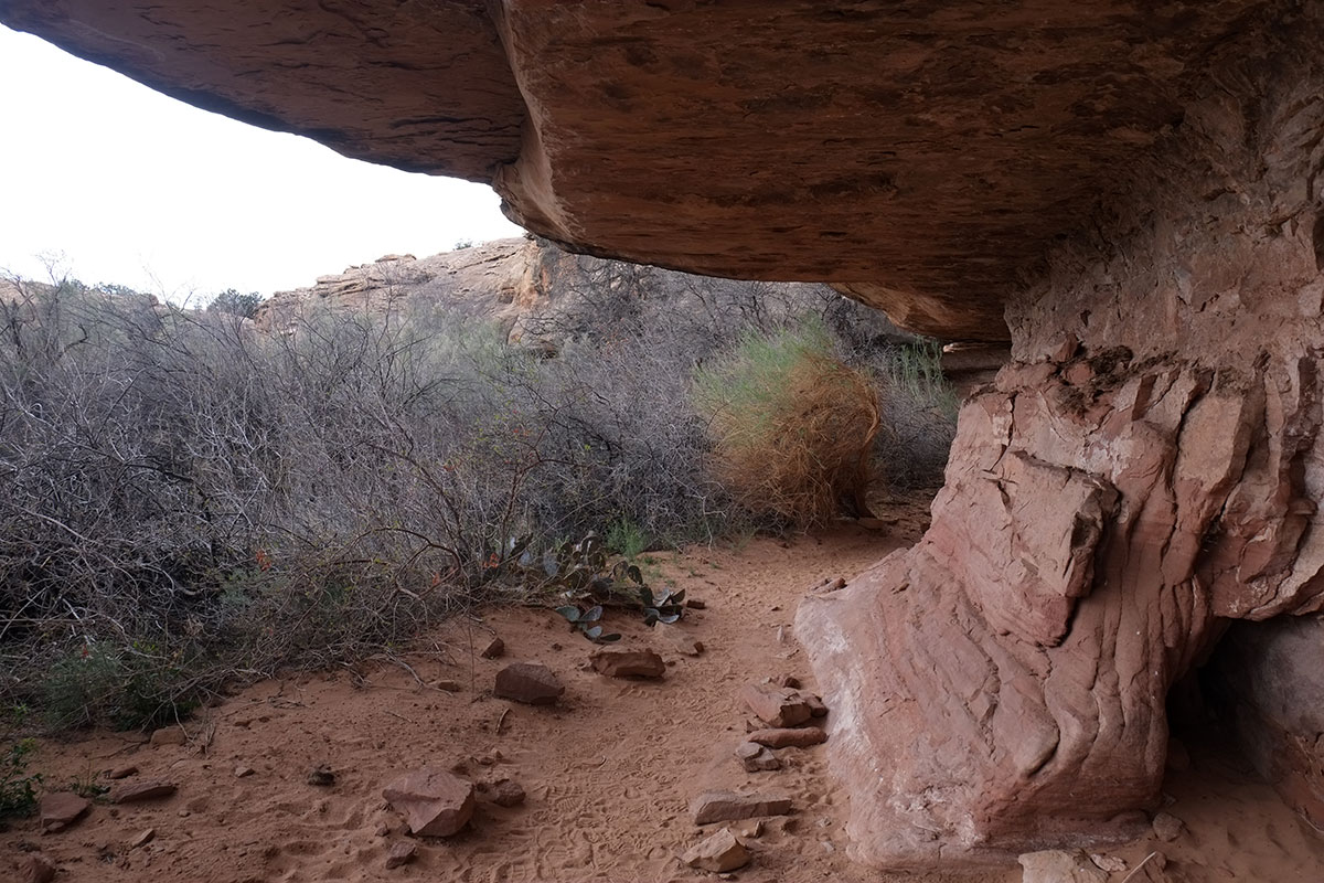 Our favorite part was the area called Cave Spring. Like many other places around here, harder rock was formed on top of softer sandstone, which erodes when exposed, leaving large overhangs of slickrock.